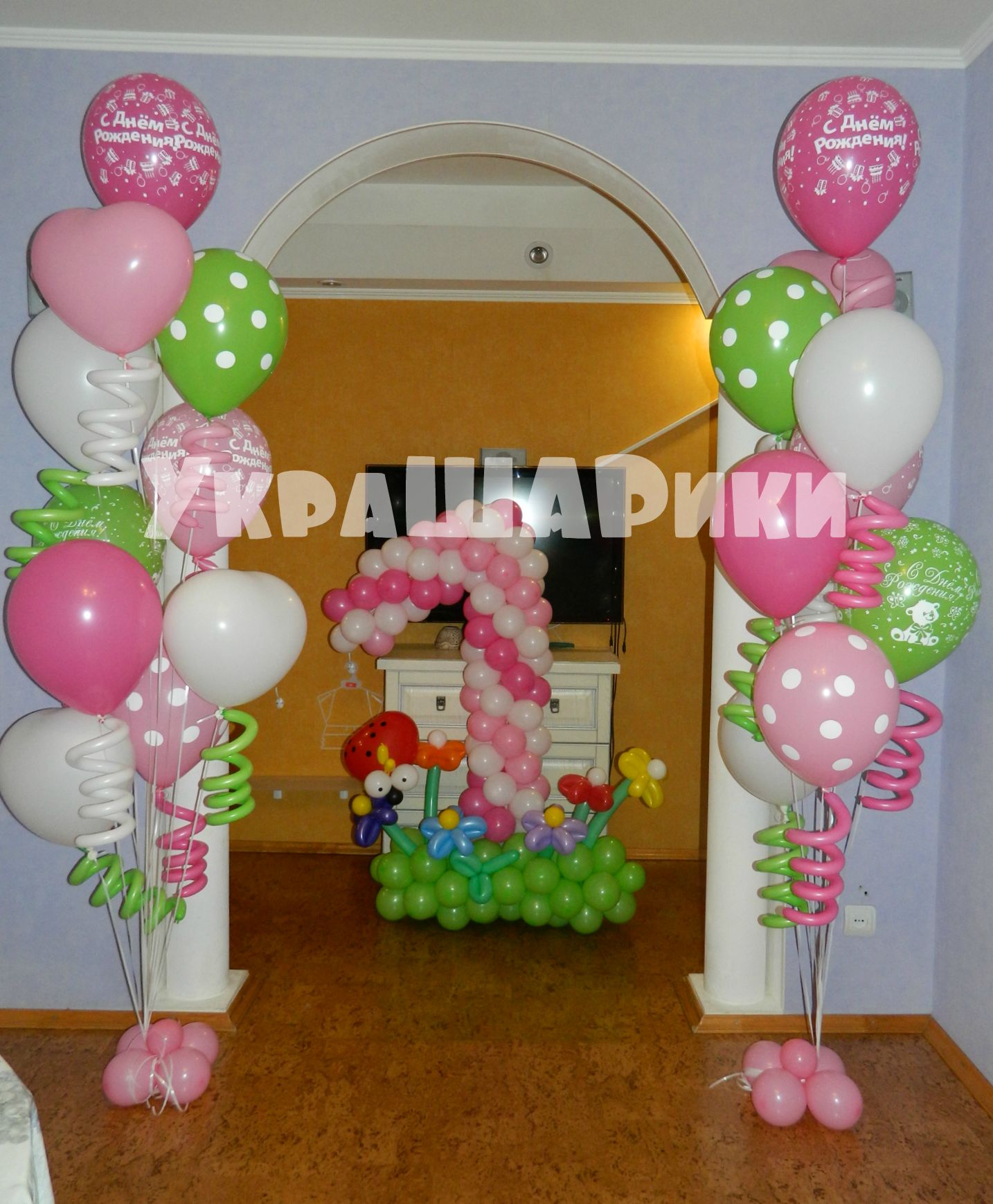 Фонтан : ( 7шаров с рисунком и сердца с обработкой 45*7=315руб. + 3шара однотонных с обработкой 40*3 = 120руб. + 10кудряшек =80руб. низ цветочек 25руб.) Итог -540руб * 2шт = 1080руб.